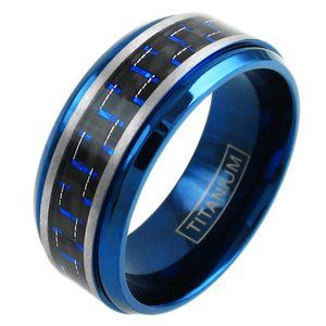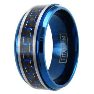 Genuine Titanium blue tone ring with black and blue carbon fiber inlay design.