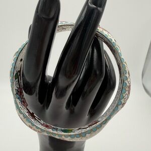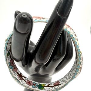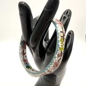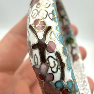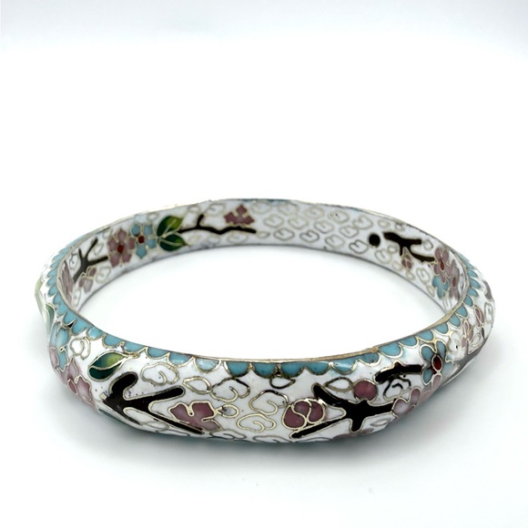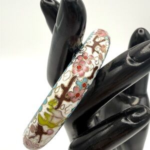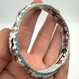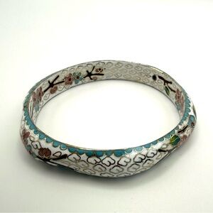 A truly special and unique vintage cloisonne bangle featuring bright white, pink, and turquoise tones accented with delicate floral detailing. The bracelet has an uncommon lobed hexagon shape, giving it a distinctive sculptural look on the wrist. Hard to find piece. It presents beautifully and is in near mint vintage condition, making it an exceptional addition to any vintage jewelry collection.