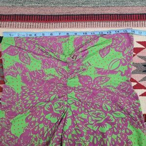 Title Nine A-line Skirt in Green Purple Floral design, stretchy, twisted Ruched Waist, Front Slit, unlined, lightweight.