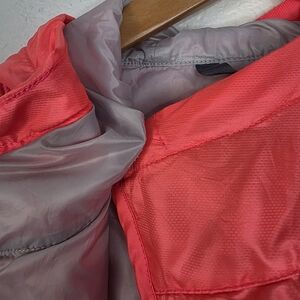 Orangey Coral sleeveless vest with gray side panels. Features a front zipper and hood. Lightweight and stylish.