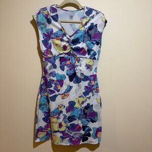 Title Nine Diamalete Dress Cap Sleeve Active Outdoor V Neck. Short cap sleeves. V neck. Ruched chest. Watercolor floral pattern.
