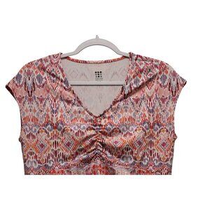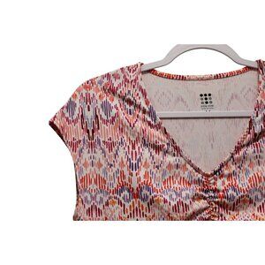 The Title Nine dress in size medium is a colorful, athletic outdoor dress perfect for camping or travel. Made with a stretchy nylon and spandex material, this knee-length dress features a V-neckline, short sleeves, and a pullover closure. The multicolor design adds a fun and vibrant touch, while the pockets provide functionality for outdoor activities. Whether for a summer adventure or a casual day out, this Title Nine dress combines style and comfort for the modern woman on the go.