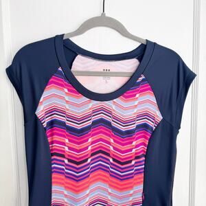 Title Nine Gidget 2.0 Active Colorful Sheath Dress Cap Sleeve Size Small S. Very good, preowned condition. Hidden zippered pocket with pink zipper pull on left waistline {secret security zipper pocket}. Navy, pink, periwinkle, orange/coral, multicolored. Polyester/spandex. Machine wash come. Tumble dry low. Moisture-wicking. Lightweight. Cooling. Lightly brushed interior pulls moisture away from the body.