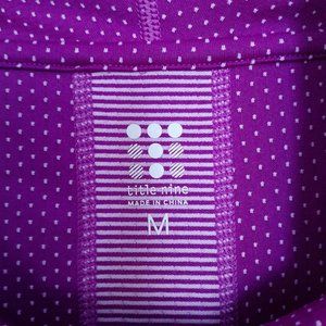 Very good pre-owned condition. Title Nine Layli's Dot and Stripe Cowl Neck Dress. Size Medium. Poly/Spandex blend. Machine wash. Two front zipper pockets. Short sleeves. Stripe pattern with polka dot accents. A purple/magenta color.