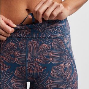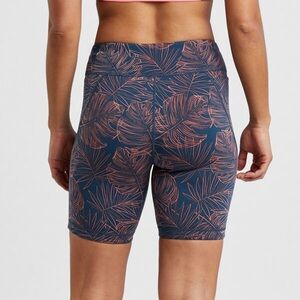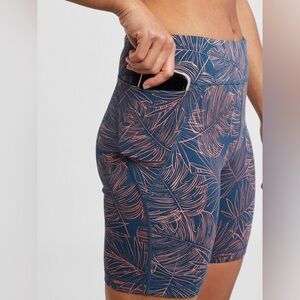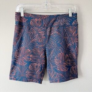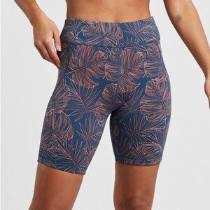 Title Nine Mad Dash Running Shorts in Aloha print- navy blue and coral/pink tropical floral print. Size medium. Highrise. Side pockets. Pre-owned, great used condition except one small area on hip where stitching is coming loose- no hole, but would need stitched to prevent hole forming.
