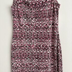 Title Nine Womens Cowl Neck Sleeveless Dress Size XS Athletic Pink Casual. Title Nine women's dress. Draped cowl neck. Sleeveless. Lightweight and comfortable polyester, rayon and lycra fabric. Pink, black and cream print. Size XS. Measured laying flat: measures 16" from armpit to armpit. Measures 14.25" around natural waistline. Measures 20" from natural waistline to hem. Measures 34" long from top of tag to hem.