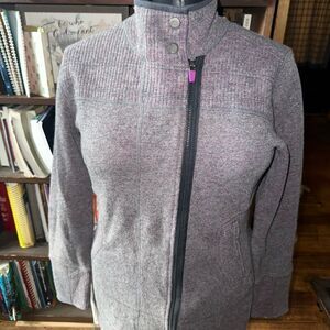 Title Nine polyester/wool blend, gray and pink, swacket, sporty, luxe, full zip sweater jacket. Pairs well with a blouse and jeans or slacks. Approximately 20 inches from armpit to armpit, 30 inches long. From a pet and smoke free house.