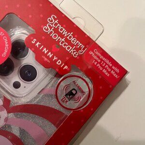 Throwback fun meets modern function with this Skinnydip London phone case featuring the beloved Strawberry Shortcake and her cat, Custard. This case fits the iPhone 14 Pro and is also compatible with the 13 Pro Max. It showcases a sparkly pink glitter base with candy-striped hearts. Durable design with precise cutouts and wireless fast-charging support. Still sealed in original retail packaging.