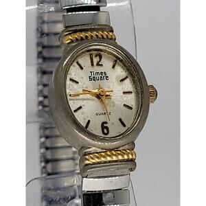 Title: Vintage Times Square Quartz Watch with Silver-Tone Case and Gold Rope