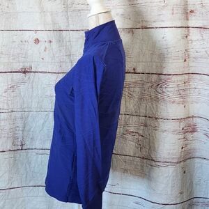 Textured purple blue lightweight half zip pullover with side zip pocket. Moisture wicking. In good condition.