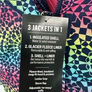 This versatile jacket is perfect for any season-fall-winter - spring and comes in a beautiful multicolor design.The outer shell is made of 100% polyester, ensuring durability and comfort for your little girl a stylish 3-in-1 design.