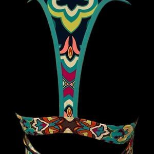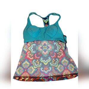 Title Nine Active Racer 'T' Back with Cut-out Tank Top, Built-in Bra |Colorful, Boho, Moroccan Design | M | EUC | MSRP $75 | Removable Padding | Stretch Fabric | 84% Nylon 16% Spandex | Hand wash only
