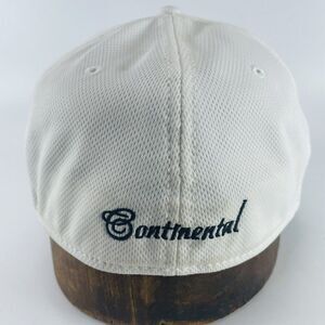 A used, lightly worn hat that is still in very nice condition. Displays very nicely, but keep in mind with white, everything shows up. Some signs of wear on the inside band as expected in a used hat. Has a "C" logo on the side with the word Continental on the back.