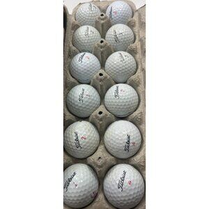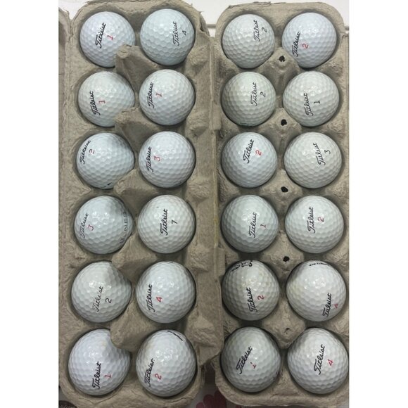 A set of 24 pre-owned Titleist golf balls, clean and ready for play. Packaged securely in repurposed cartons.