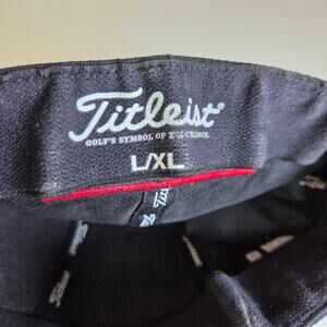Clean, modern Titleist Pro V1 A-Flex fitted golf hat in black, size L/XL. Lightweight, grid-texture performance fabric with stretch fit. Embroidered Titleist script front, FJ logo on one side and PRO V1 on the other; Titleist patch at back. Very good pre-owned condition—no rips/holes; light wear on the inner band only.