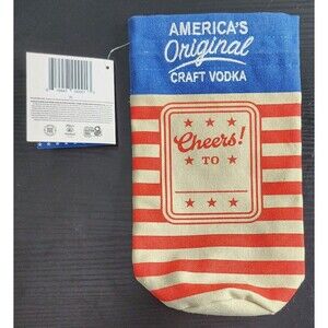 The Tito's Handmade Vodka Red White & Blue Burlap Drawstring Bag is a unique and collectible item featuring the popular distillery's branding. Made from burlap-like material and measuring 10" tall with a circumference of ~3-3/4", this original piece is perfect for storing a 1L bottle of Tito's vodka. The multi-color embroidered design adds a patriotic touch to this officially licensed product, showcasing the distillery's theme and country of manufacture in the United States. Ideal for fans of Tito's Handmade Vodka, this bag is a must-have for any distillery memorabilia enthusiast.