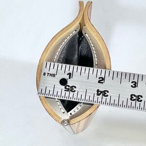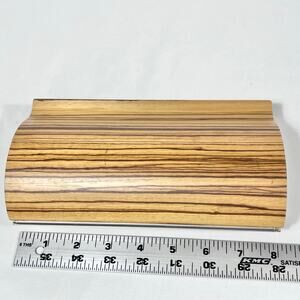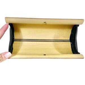 Introducing a Tivi Colorado wooden clutch handbag purse with a clamshell design and elegant wood grain finish. Features black aloe leather accents and a magnetic closure. This purse is in great condition with some minor scratches as shown in pictures.