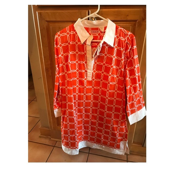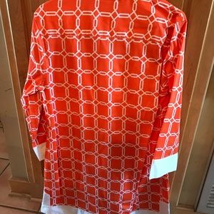 Is this tunic red and white or orange and white - hard to tell on my iPad. Also can you please tell me the measurements armpit to armpit as well as the length? Thank you.