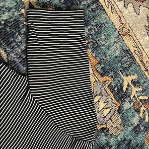 Stylish black and white striped top. Features a high neckline. Short sleeves for a casual look. Navy/ White stripes