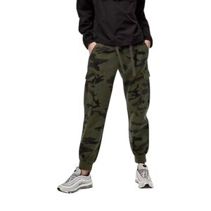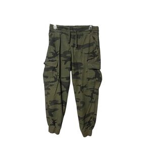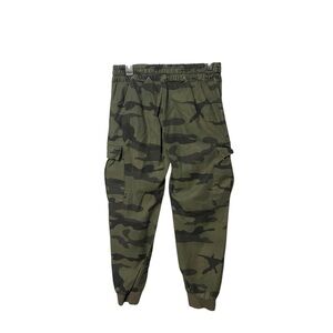 The camouflage pattern consists of various shades of green and brown, typical of military-style clothing. These pants are designed as a modern take on classic cargo pants, blending functionality with a contemporary style.