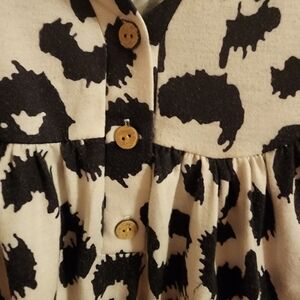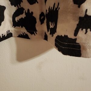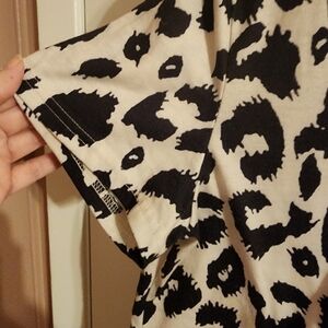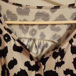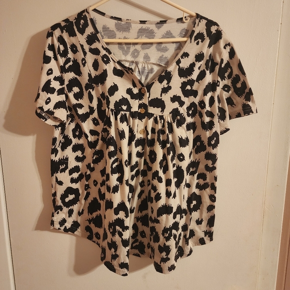 Short-sleeved babydoll-style top with three-button detail. Beige background with black print. No tag, so size unknown, but probably Medium. Like new condition.