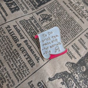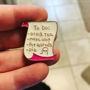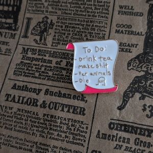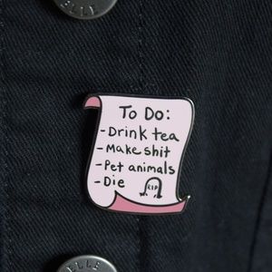 To Do list enamel lapel pin brooch. The list says "To Do: -Drink Tea, -Make shit, -Pet Animals, -Die and -RIP". The RIP is in a headstone. The list has white enamel with pink enamel detail set in gold tone metal, pin has a metal clasp backing. Approximately 1” high. Item is New.