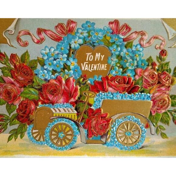 To My Valentine Postcard Automobile Car Jalopy With Flowers Roses Deep Embossed