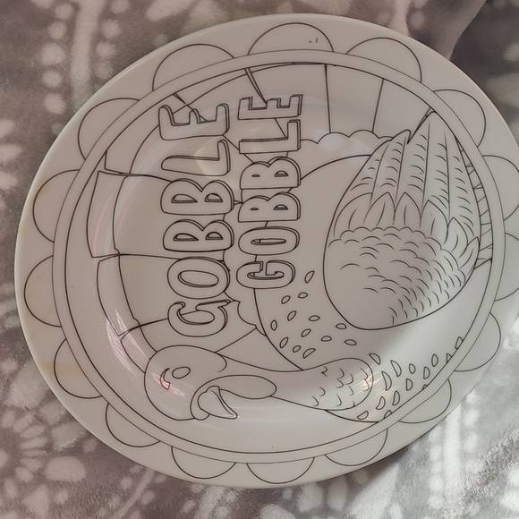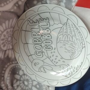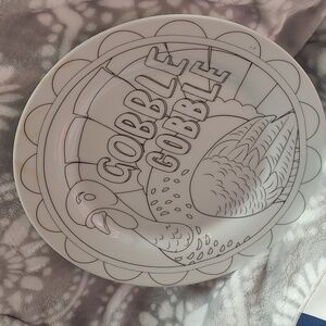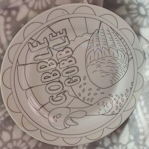 White plate with a turkey design and 'Gobble Gobble' text. Perfect for festive occasions.