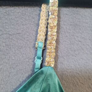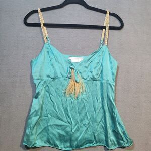 Gold Straps. 100% Silk. Adjustable Straps. This looks new. Green/Turquoise. Feather Accent. Dry Clean Only