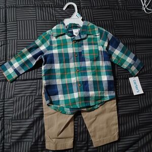 The brand is Carter's, it's a 6 month plaid and pants combo. Never worn or taken off the hanger, still has the original tag. My son wasn't able to fit into this while it was still cold out.