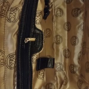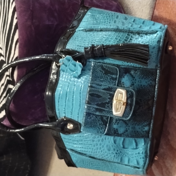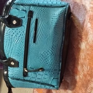 MC first with like a bluish green snake skin pockets on the front there's pockets inside there's one on the back to put stuff in
