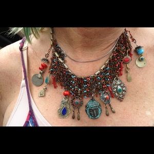 What fun I have wearing this Buddha inspired necklace some of the charms are hand painted by me, some are from Afganstan coral and turquoise beads. Can be worn with shorts, jeans, or make it fancy for a night out.