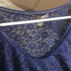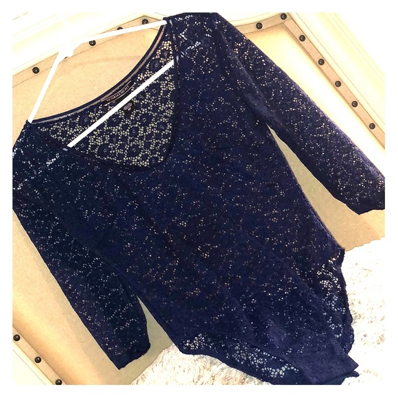 This is a size small Victoria’s Secret see through lace stretchy material body suit. Super cute if you wear a bra Leyte or cute bra underneath! Good condition. Navy blue