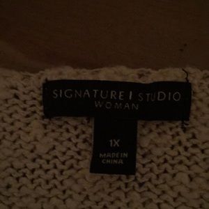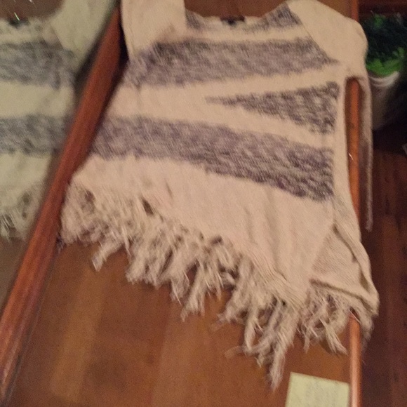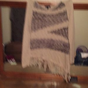 Tan long sleeve sweater with fringe on bottom and a slanted bottom