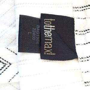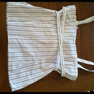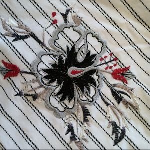 Adorable & never worn! White cotton with black stripes & flower appliqué. Side zip. Loops for straps. Marked as a Large but fits as a Medium.