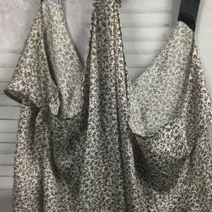 size: 1x or 2x White satin tank with small floral print and black straps. Back has a racerback style and front has a bust overlay with tie. Good used condition. Bust: 23.5" Length: 29" flat lay