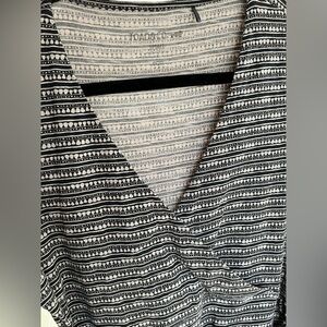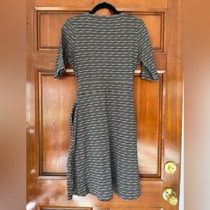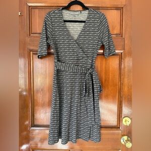 Toad & Co faux wrap dress with waist tie. Pattern is a tan and black geometric pattern with small circles. From my personal closet, only worn once or twice so still in like new condition with no flaws. Please see photos for measurements.