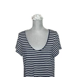 Women's Toad & Co Muse dress in navy blue and white stripe. Lightweight stretchy jersey knit. Side cinch with ties and pocket on the left side. Great pre-owned condition!