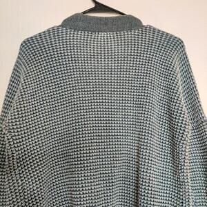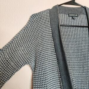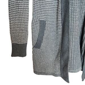 Toad & Co Recycled Denim waffle knit long line cardigan sweater. Women's size small. Two tone gray knit with dark gray, slightly denim blue trim.