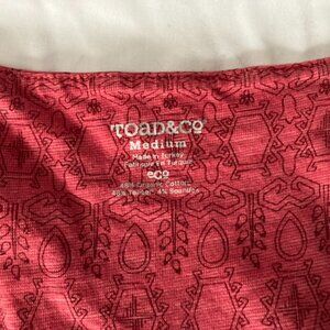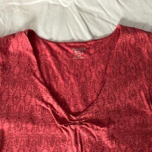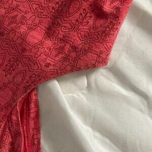 A-line silhouette, v-neck, double layer bodice, cap sleeves, hits above the knee. Soft, breathable eco-friendly organic cotton and TENCEL™ Lyocell slub with a bit of stretch for added comfort. Features: Inherent odor control. Size: medium. Coral color.