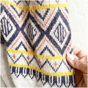 The Toad & Co Sweater is a stylish and cozy addition to any man's wardrobe, featuring a fair isle Aztec print in a tan color. This tight-knit wool sweater is designed with a crew neckline and long sleeves, making it perfect for those chilly winter and fall days. The pullover style offers a comfortable fit, while the XL size ensures a flattering silhouette. Ideal for travel, parties, or business meetings, this sweater from Toad&Co is a versatile and fashionable choice for any occasion. Dry clean only to maintain its quality.