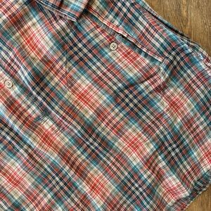 Stylish plaid button-up shirt with long sleeves. Features a mix of red, blue, and white colors.