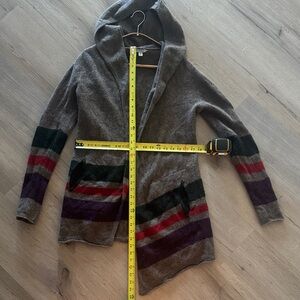 Sod, warm brown cardigan with a hood and two pockets. Features colorful stripes on sleeves and hem. Perfect for layering. Lambwool. Soft. Shrunk a little. Pet free and smoke free home.