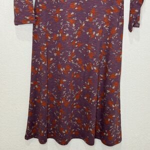 Purple dress with allover red/orange and gray abstract geese print pattern