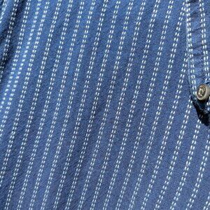 Pre-owned in excellent condition. Fall 2019 collection. Looks new. The detail on this is shirt is great and the color really pops. The shirt base is blue and the white dashes are actually a white stitch. Buttons on the back and sides of the collar. Grey on the inside cuff and back of neck. My husband looks great in this but has sized out of it. It's dressy but still casual/comfy.
