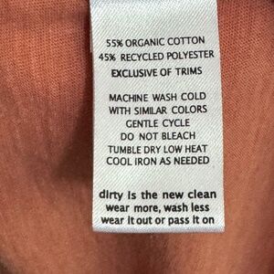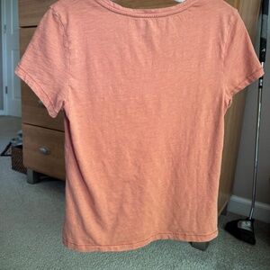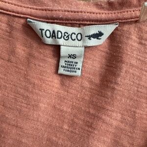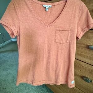 Toad & Co V-neck pocket t-shirt in women’s XS. Slub texture, organic cotton & polyester, soft orange.