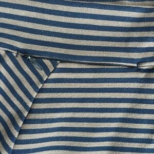 Features tiny stripes and angled seams; curved side panels with stripes on bias