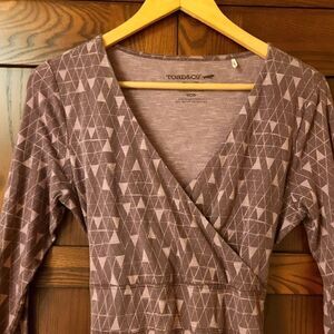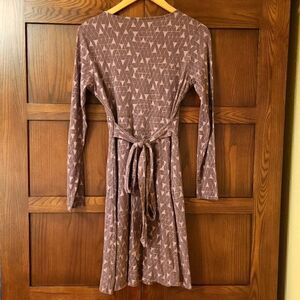 Toad&Co Wrap Dress with attached waist tie. Eggplant purple with triangle graphic print. Stock pic included to show fit but true color better represented in pics of item. EUC with light washwear.