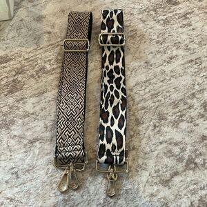 Set of two stylish bag straps. One features a bold animal print, the other a geometric pattern. Both have gold hardware.