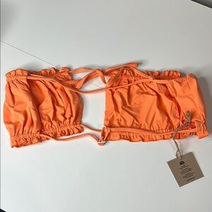 Vibrant orange strapless bikini top with ruched detailing. Perfect for a stylish beach day. 0048